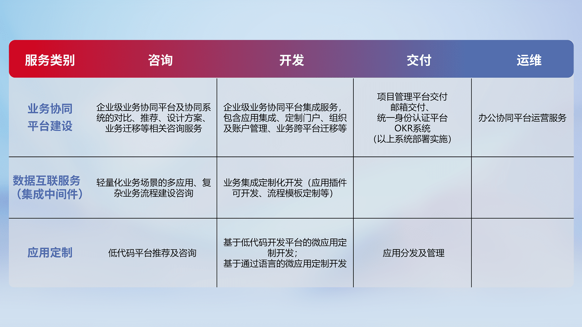 针对钉钉、、、企微、、、IDaas等平台级产品提供产品的规划、、、、方案、、、、交付、、、、定制化开发等服务,,实现如统一协同办公、、智能客户服务、、混合会议管理、、、、智能数据查询、、等业务场景,,,,实现数字化转型。。