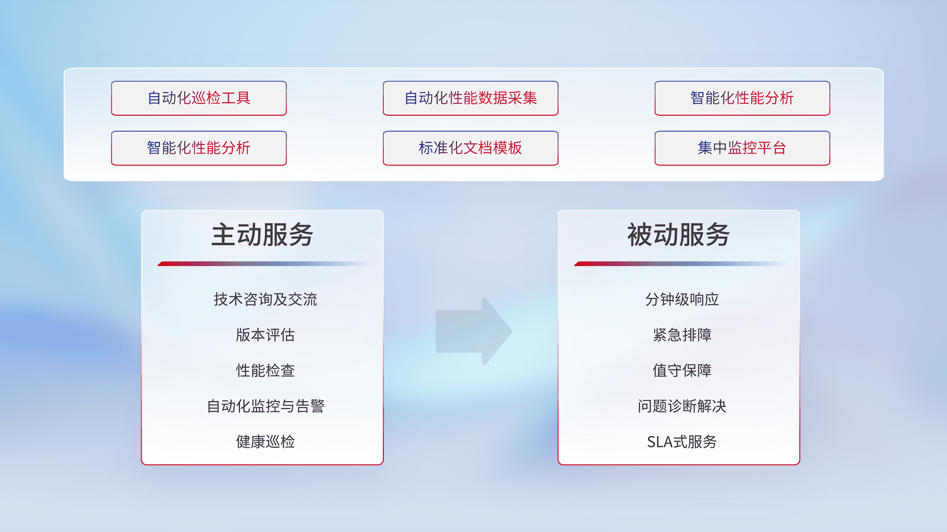 智能化工具和标准化文档,,,保障服务质量,,,提供主动服务(包含技术咨询、、、、版本评估、、、、性能检查、、、、自动化监控与告警、、、健康巡检)和被动服务包含(分钟级响应、、、紧急排障、、值守保障、、、问题诊断解决、、、、SLA服务)。。。。